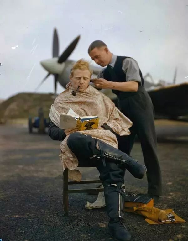 二戰期間,一位英國皇家空軍飛行員正在理髮