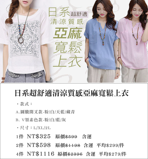 商品訊息簡述: 平均每件最低只要279元起(含運)即可購得日系超舒適清涼質感亞麻寬鬆上衣任選1件/2件/4件,款式:圖騰開叉款/V領素色款,皆有多色多尺寸可選?