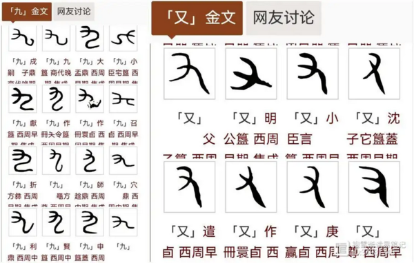 白军鹏及黄锡全把第一个“又”字当成“九”,和下方的“六六一”组成了四位数字卦,这种说法是错误的。所谓的四位数字卦可以说不存在,基本都是释读错误造成的。金文里的“九”和“又”截然不同,如下图所示,图左为“九”,图右为“又”。