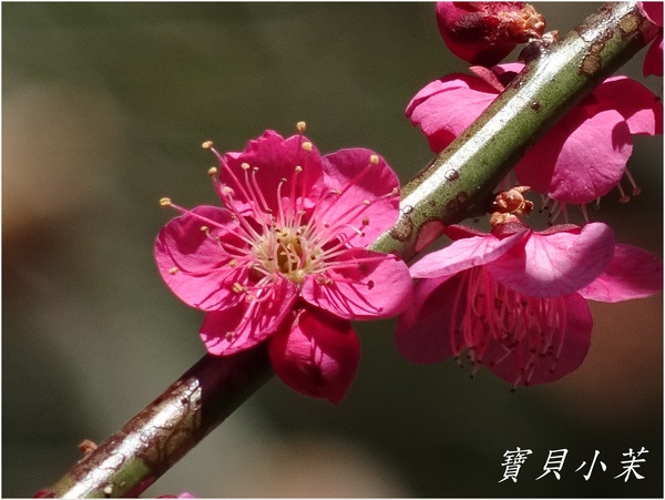 紅色與粉紅梅花:包括重瓣的紅牡丹 帶有紅色的寒紅梅及粉紅色的胭脂梅