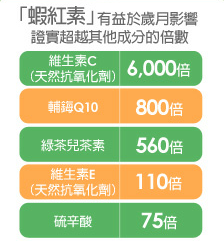 近年來,許多研究人員陸續發現,已經在自然界存在很久的蝦紅素 (Astaxanthin) ,其抗氧化能力竟然高達Beta胡蘿蔔素的10倍,葉黃素 ( Xanthine )的200倍,甚至是維生素E (x-Tocopherol)的550倍強;可以說到目前為止,沒有任何一種抗氧化劑可與之比擬,所以有人乾脆稱之為「超級維生素」或「維生素X」。