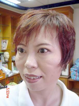 妹妹從事房屋仲介業,是個能幹拼命的上班女郎,但偶而因為工作壓力與經濟壓力的關係,所以臉上常會不乖的迸出幾個小痘痘,或許在額頭、或許在下巴或臉頰。因為上班得面對同事與顧客,所以溫雅習慣上妝。她平日的彩妝僅僅只是上粉底跟塗口紅畫眉毛而已,整體而言稍嫌平面,所以我就教她怎樣畫個立體一點的彩妝,並且順便教她怎樣修飾臉型與持妝技巧。