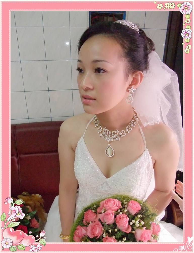 佳潔是我11/2服務的新娘,在尚未見到她之前便對她油然而生一股莫名的親切感,或許我跟她同姓吧?但是自接到佳潔的詢問電話至結婚的前一天我們方才初次見面,中間未能有面對面的溝通,因為佳潔遠在三峽呀,這一點讓我著實傷腦筋,心裡想著:這位準新娘怎能如此老神在在呢?幸好佳潔傳來婚禮當天要穿的禮服,讓我至少可以看著她的照片與禮服設計婚禮當天的造型。