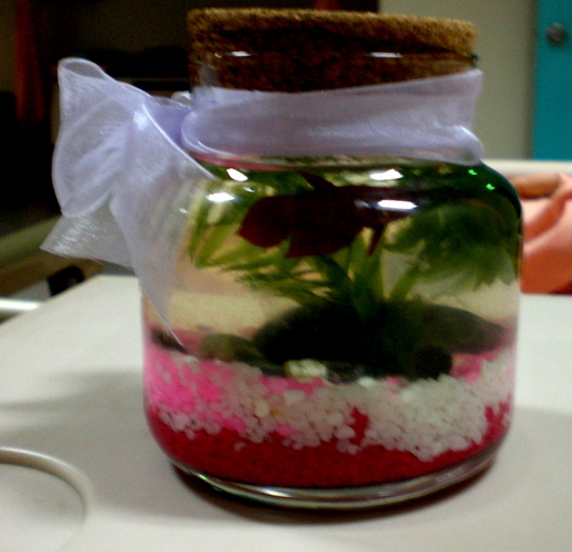 這次到馬偕回診,順便去逛愛買,那兒有個賣魚的攤子,我每次都會看一看,大部份賣的都是整套的魚缸設備和魚,別說我買不起、買得起也沒地方放啊,結果咪咪就抱來這一小缸魚:『馬迷妳看可不可愛?』「馬迷算美麗、妳才是口愛啦,」『ㄏㄡˋ!我是說魚啦,』「造景不錯,粉紅系列的石頭配蝴蝶結,OK啦!可是那條是鬥魚嗎?妳去問一下小姐、如果不是可不可以換?」結果就是我的櫃子上又多了一個終於會動、可是卻還是不能跟我對話的生命體。