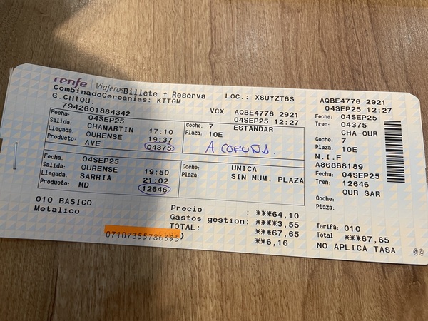 馬德里 ~ Sarria高鐵+巴士車票:68 歐元
