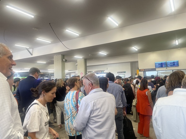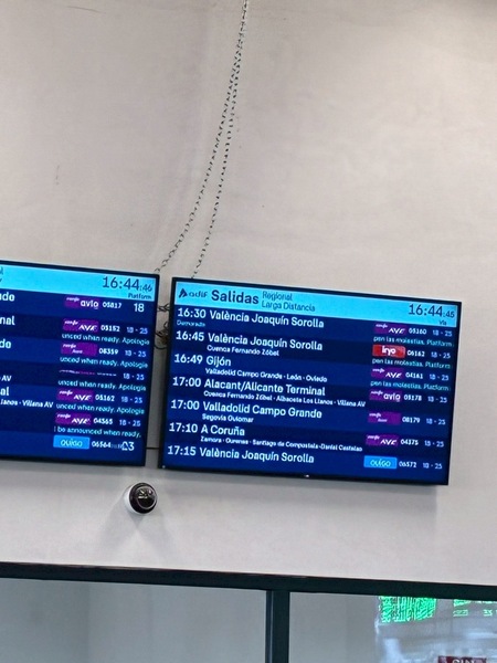 逛完超市回到車站,車站裡的人比剛剛更多了,滿滿的人究竟發生什麼事了?我問AI,它說是資訊系統伺服器宕機,高速列車與 Cercanías 的調度、到發資訊系統全面癱瘓。由於乘客擅自下車進入鐵軌,存在極大危險,因此警方必須介入,阻止民眾進入軌道。所以才會有大批警力站在車站入口。牌子上一班班延誤的車次,真讓我們頭皮發麻,今天肯定到不了Sarria了,頂多只能到換車那站。