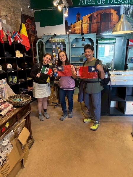 09:40買到朝聖者護照,她本來想帶我們去教堂買的,但教堂沒開,所以找了個小店買。買了護照後,在另一家店買了朝聖貝殻,我們決定在起始點和終點各買一個,而這個寫著2025 Sarria - Santiago的貝殼就掛在老公的背包上,由店員親手綁上。