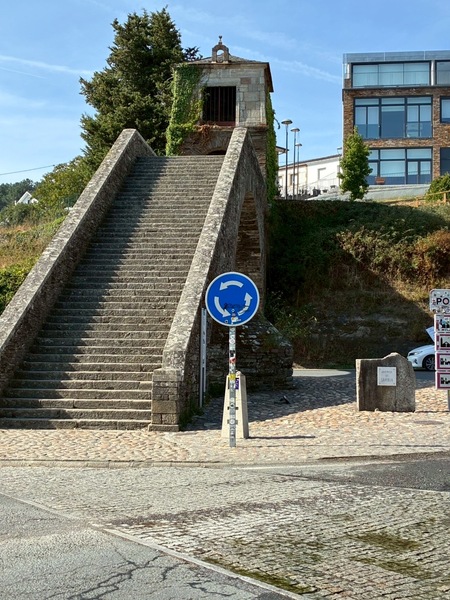 要到Portomarín必須過Miño河,這條河超大的,河水感覺也很深,眼前是老公說的長長的階梯,就那時候的我們,實在沒有力氣爬上去。這時墨西哥女孩說我們不用爬階梯,要走左邊那條馬路,但怎麼看都不覺得那裡會有庇護所啊!原來還是要走上一條長長的上坡,庇護所就在第一間。墨西哥女孩按了按鈴,我們用僅剩的力氣卸下背包,拿出護照和朝聖者護照準備辦理入住,但來的女人卻告訴我們不在這裡。不會吧!我快瘋了,我根本走不動啦!雖然心裡一堆抱怨,但還是背起背包跟著她走,她看我像是累垮了,竟然說可以幫我背,人真好哇,但我不好意思啦!這下又慢慢地跟著她走了將近10分鐘,其實不遠啦,但就是走不動了。