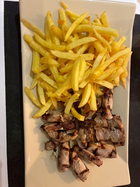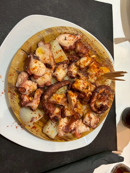 她有口袋名單,直接領著我們過去餐廳。餐廳沒有紙本菜單,必須掃QR Cord看菜單,然後再告訴服務人員想吃什麼。我們點了一份水煮章魚和牛肉配薯條,墨西哥女孩也點了水煮章魚,她還點了湯。飲料是兩瓶可樂和老公的啤酒。餐很鹹,真是打死賣鹽的,但並不難吃!