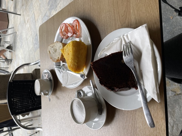 11:00吃早餐,順便休息一下,今天狀況超好,總是第一天嘛,不好的話後面幾天怎麼辦?早餐一人點了一份蛋糕和拿鐵,咖啡好喝極了,但實在太小杯啦,早餐份量很足,我跟老公說明天開始兩個人吃一份就好。到這裡已經走了4公里嘍!