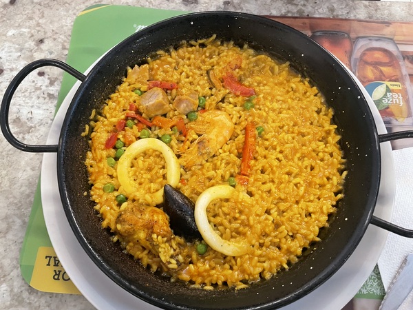 12:30入住庇護所Albergue Ultreia,這間庇護所步行3分鐘的距離有一家家樂福,庇護所樓下是他們自己開的餐館,餐館蠻大的,我們決定西班牙海鮮燉飯就在這兒吃。