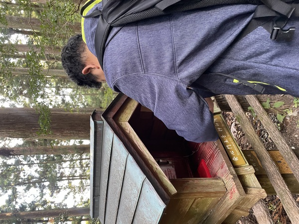 中午12點多,我們回到本宮大社南殿領取雙朝聖,出示西班牙朝聖證書和從發心門王子走到本宮大社的押印本,但但但當服務人員翻開押印本時,她問我們有沒有去走那智大社時,我們傻了,因為為了行程安排順暢,原本是想等拿到雙朝聖後,明天再去走,卻沒想到服務人員告訴我們除了要走從發心門王子到本宮大社的七公里外,還要拜訪速玉和那智兩個大社。這這這該如何是好?於是服務人員問我們什麼時候會去走那智大社,我們說下午有安排去走,她這才通融我們先取得雙朝聖。