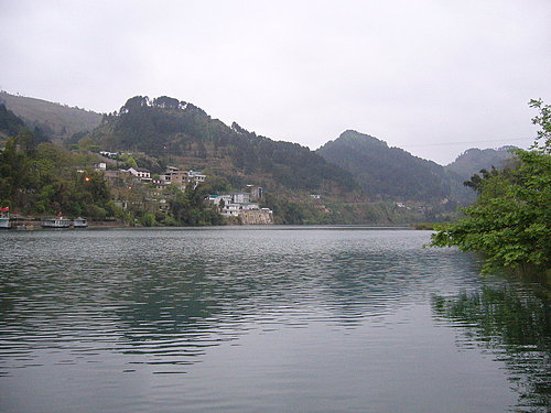 山和樹倒映在湖裡,一陣風吹來,竟撥亂了原來的影像。湖水清澈得見了底,一條又一條的小魚兒悠閒的游來游去。湖光山色,正想著租條小船划過湖面,就見到對岸停靠著的幾艘遊艇,原來這兒是個遊湖區,那就難怪這兒渾然天成的美景了。