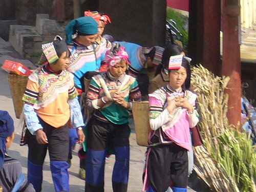 比起住在附近村落的哈尼族,彝族女子的服飾就顯得十分華麗,她們衣服的顏色五花八門,屁股後面的兩片繡工一流的墊子,竟是為了避免工作時弄髒褲子的墊布,頭上的頭巾也相當鮮豔,個性上比哈尼族女子開朗外向,臉上的笑容顯得燦爛許多。