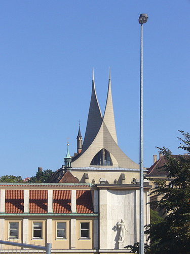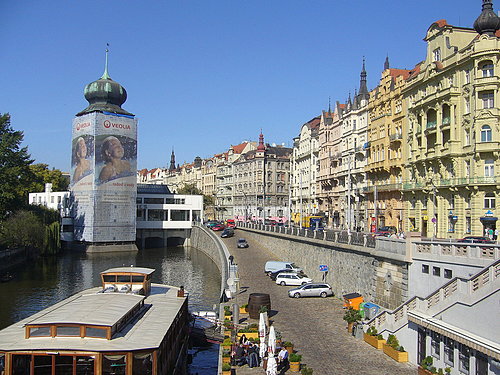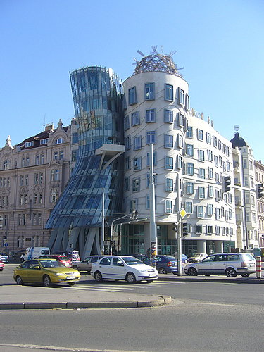 從高堡區沿著伏爾塔瓦河的方向一路下山,我們要去看“會跳舞的房子”,距離有點兒遠,但感覺還蠻不錯的。今天天氣很熱,我們邊走邊脫去身上的外套,太陽似乎一直追著我們不放,擺脫它的方法就是改走對面那條紅磚道。過了馬路後,更親近伏爾塔瓦河了,河面被陽光灑得發亮,河裡那隻天鵝大得嚇人,岸邊是曬著太陽的人,老外就是愛曬太陽,這樣的畫面在台灣應該很少見吧?!