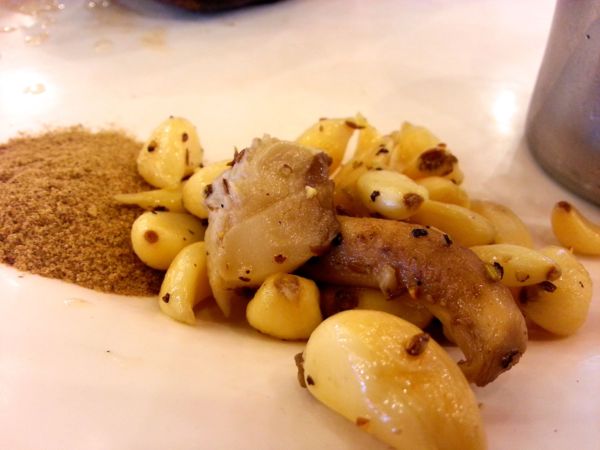 盤中胡椒鹽、烘烤的蒜頭,香,第一次這麼的不怕吃蒜頭。