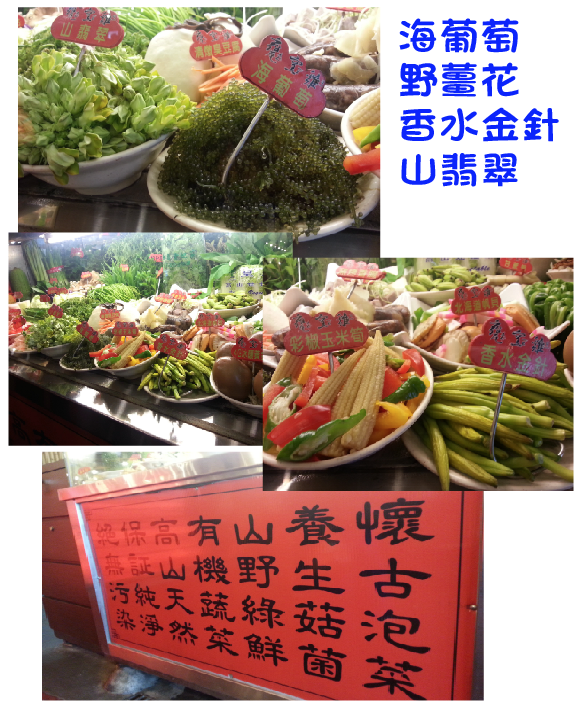 除了甕窯雞,來幾盤山野綠蔬,健康一下。櫥窗裡,這麼多種,怎麼點呀?傷腦筋耶,吃吃看點餐先生的推薦,三道野菜。