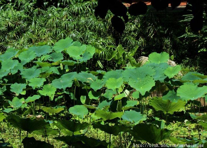 拱曲橋下,小小荷花池,花苞長成中,荷花開還要再等等。