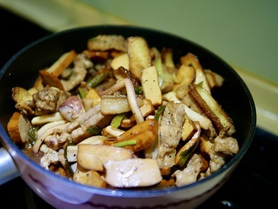 1.不沾炒鍋中放入條狀五花肉後再開中小火,讓熱鍋逼出五花肉的油脂,顏色炒成白色的五花肉代表肉熟了,約3~4分鐘。