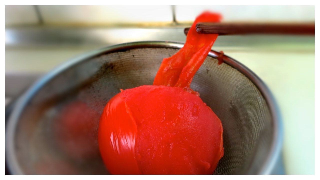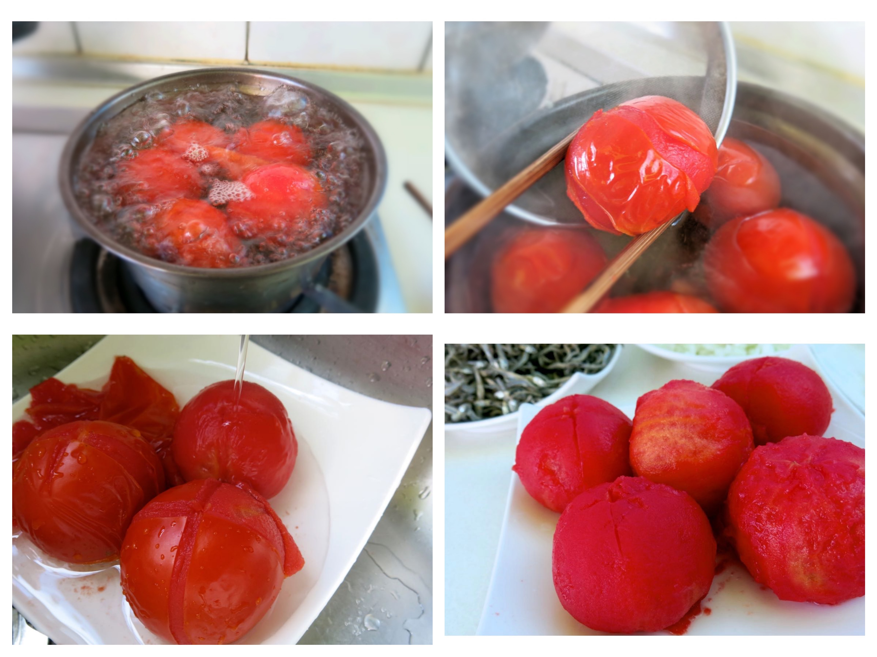 1.洗淨後,番茄上方的皮切十字,放入熱水中,煮約3-5分鐘,煮到看到番茄皮在鍋中呈現自然剝開後,可熄火了。