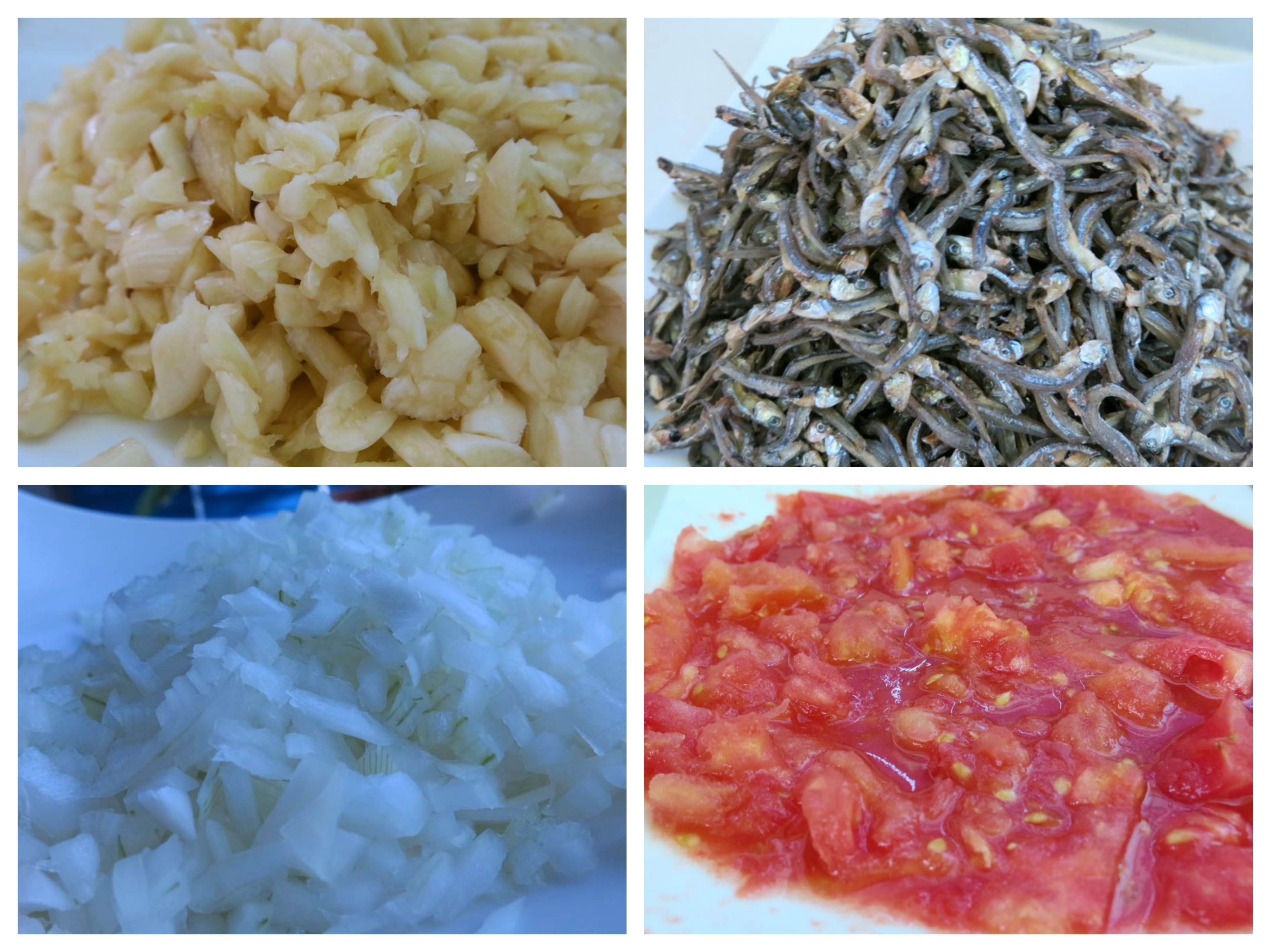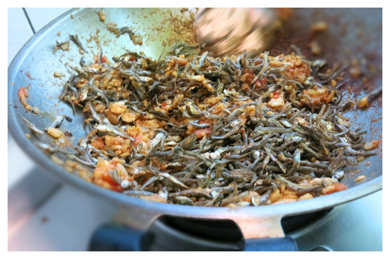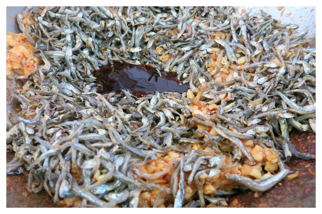 加入炒過乾扁的丁香小魚拌炒,翻炒到小魚乾完全融在蒜蓉洋蔥蕃茄中,在鍋的中間留一個小圓洞放入醬油後繼續翻炒,醬油平均上色在小魚乾上,翻炒中一樣的要注意不黏鍋,要炒到鍋中沒有水分的乾鍋,就完成了。
