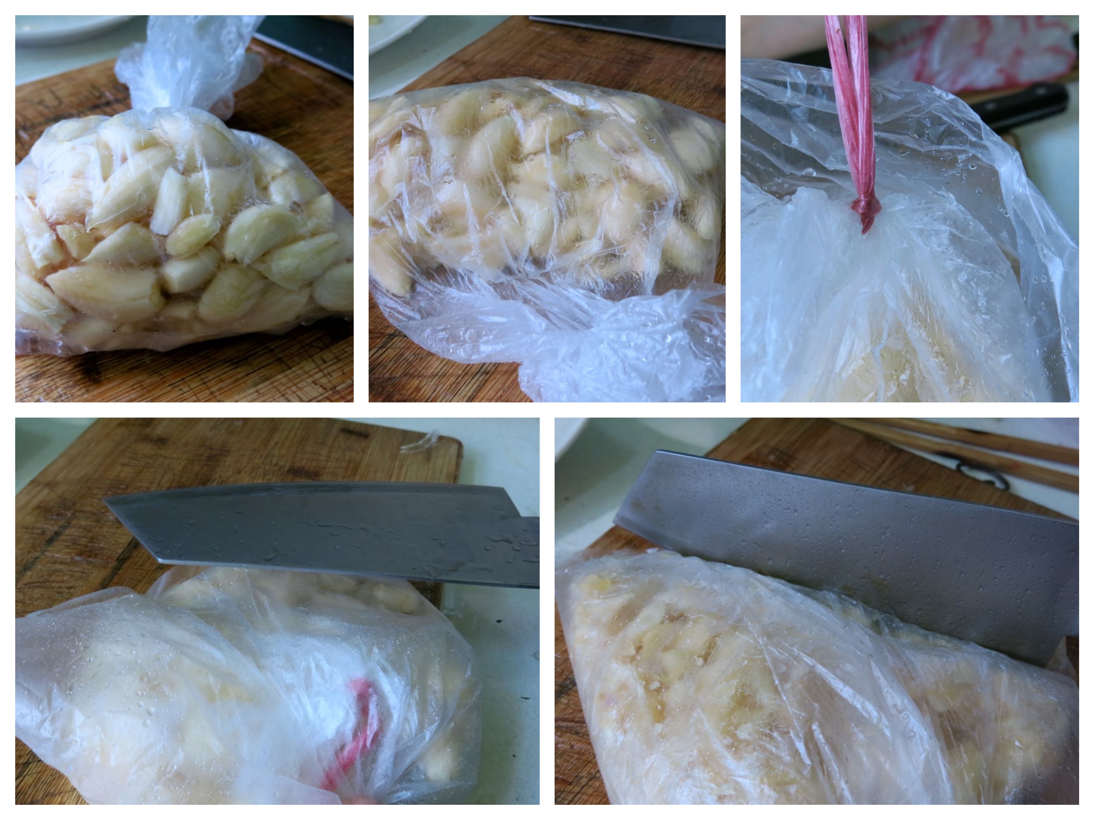 將蒜頭放在二個塑膠袋裡綁緊