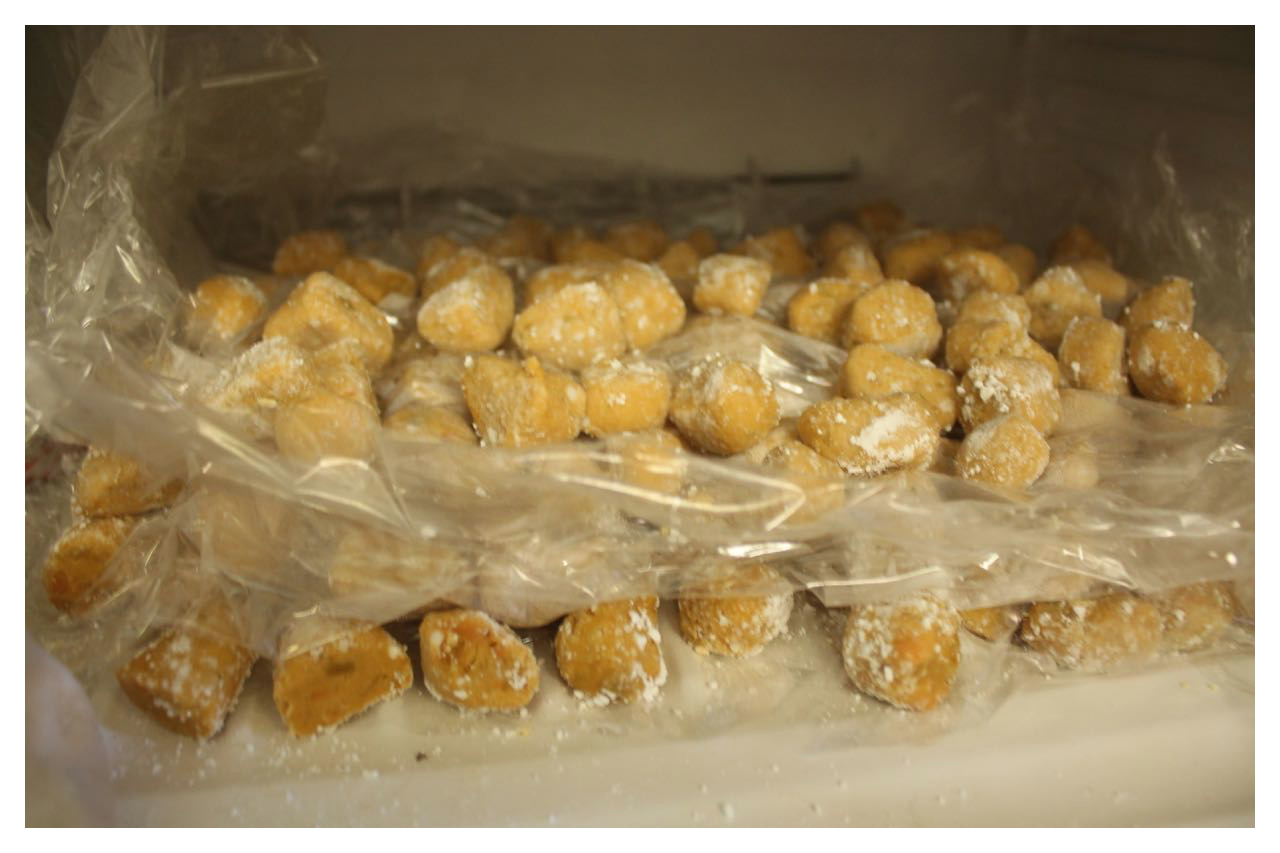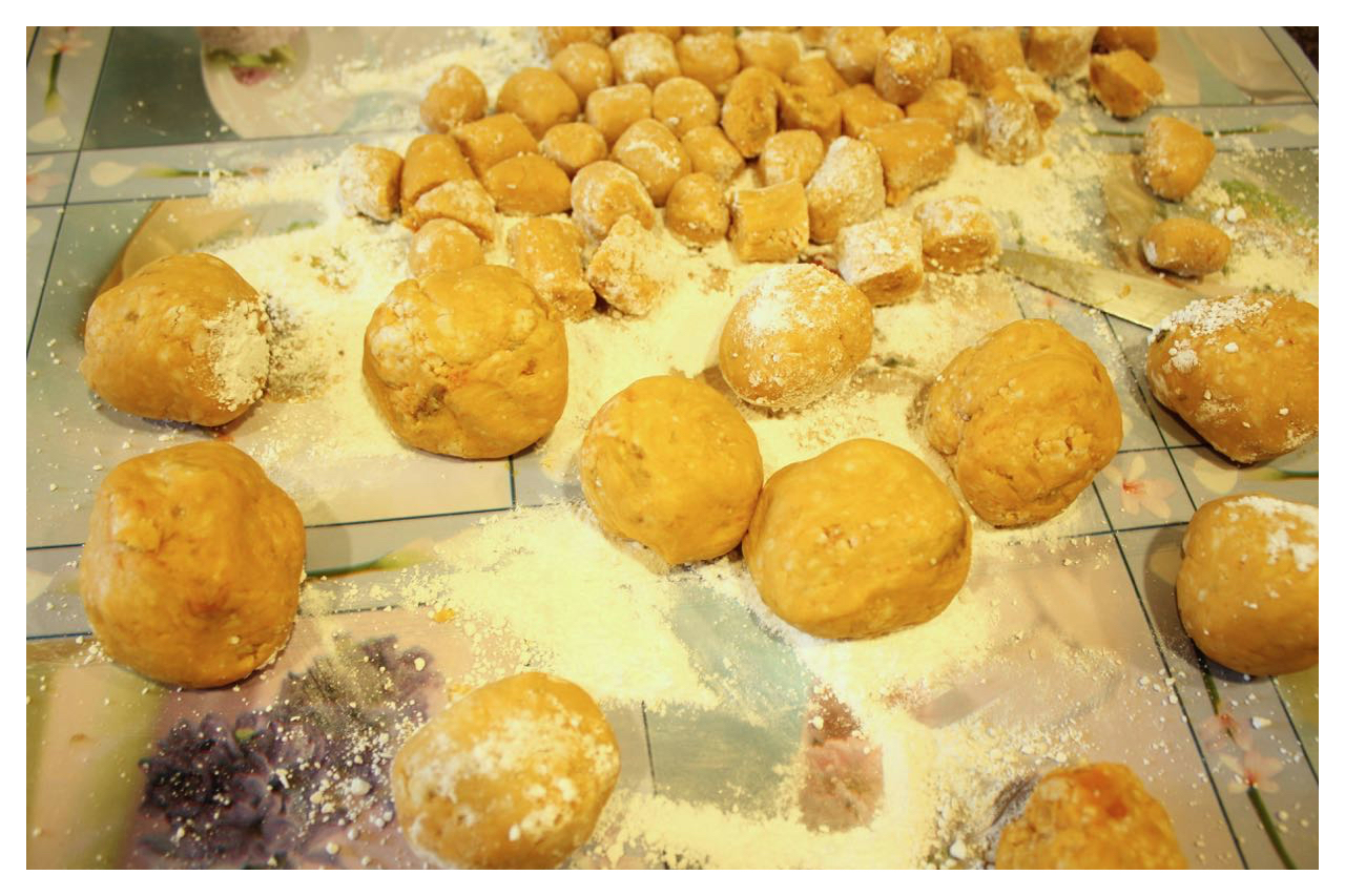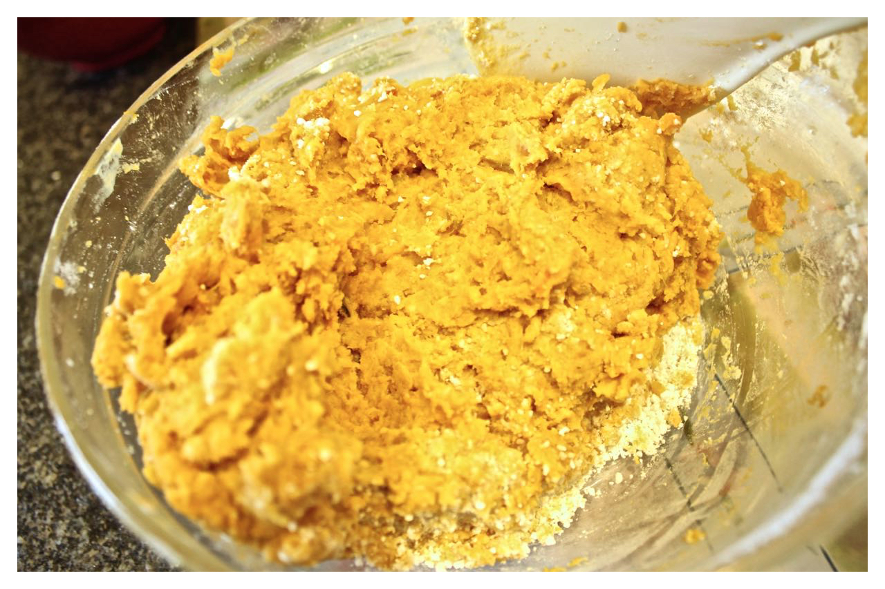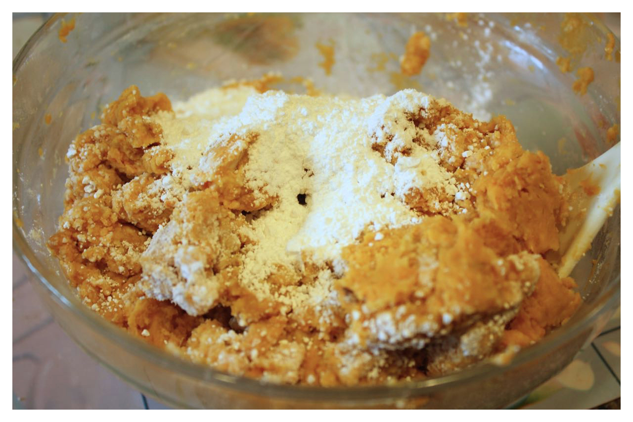 以產地來看地瓜水分,花蓮有機地瓜水分較多,樹薯粉加多一些,金山地瓜的水分較少,樹薯粉放少一點。