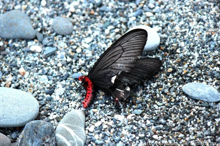 追了一隻漂亮的黑色蝴蝶,沒追到,卻看見,躺在沙石頭上的這一隻,飛不動了,翅膀尾端的紅色點點不見了,仔細觀看,真的是漂亮,身子還是火紅的紅色呢!網路資訊比對圖片,像是大紅紋鳳蝶。