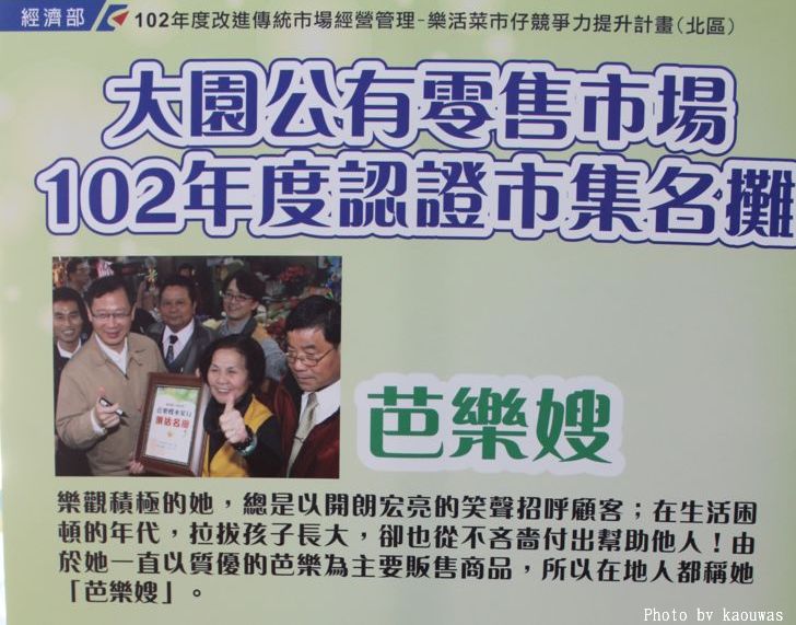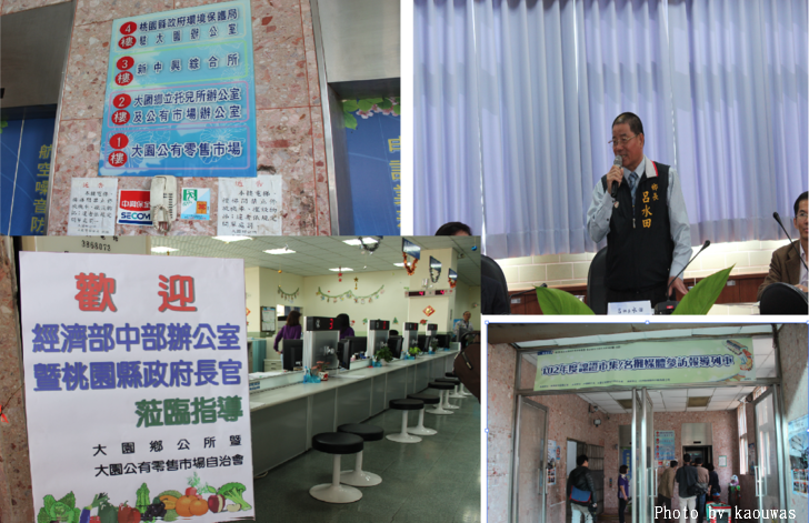 下方的圖片,說出了來到這裡的目的。轉化市場靈魂的人物,大園鄉鄉長呂水田先生。為配合桃園航空城計劃的發展,除了縣政府的特別款再加上鄉公所的自籌款,進行了改善更新的工程,把原本破落髒亂的老市場,改造成為一個新穎、舒適的購物賣場,這裡已經是具規模、具競爭力的示範賣場,看在居台北市的卡娃思眼裡,感動的興奮地想要將這裡的好,第一時間分享。