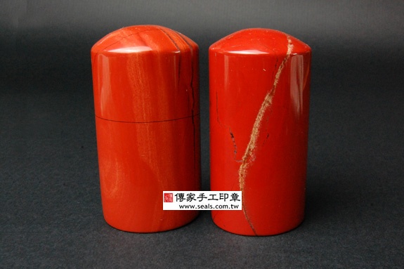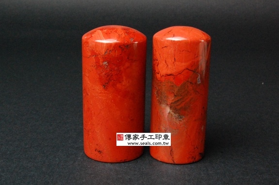 1.        紅碧玉公司大小印章實際成品。紅碧玉的公司印章,會用柱狀的造型,這樣印材可以充分被運用。紅碧玉公司印章的尺寸很多,約在:長寬2.5公分,高6-7公分之間。我們也有加長加大型的尺寸,長寬在3公分左右(需要加價)。紅碧玉個人印章,雙章,一圓一方。圓章象徵「財源滾滾」,適合當做銀行開戶使用。方章象徵「方方正正」,可以在簽約、購買房子時,可以使用。每一個紅碧玉印章,會有屬於自己的礦色和紋路。注意:因為紅碧玉是天然的礦石,所以印章的尺寸會隨著原礦而調整,大小不一致。