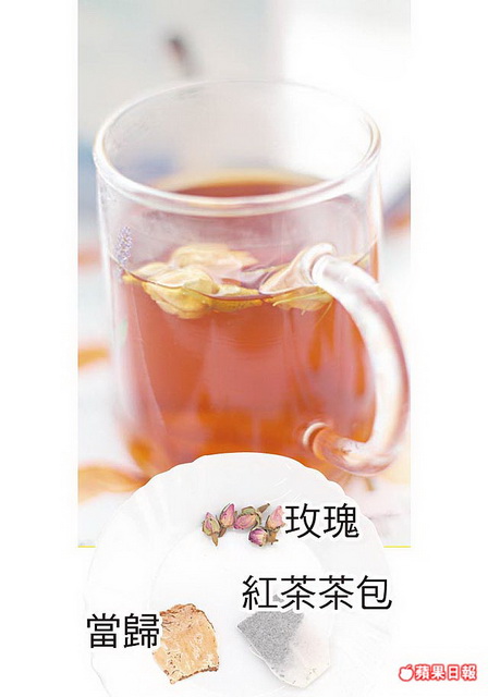 功效:玫瑰與當歸可活血調經、緩經痛,當歸還可補血,紅茶含咖啡因,有止痛效果,適合經期易小腹悶痛,或血塊較多、不易排出者。