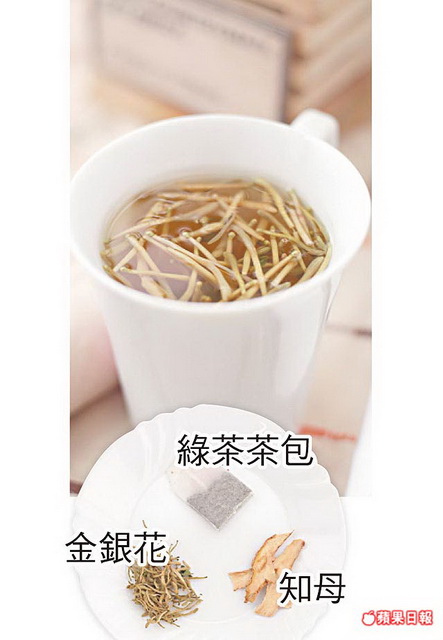 材料:金銀花和知母各2錢、綠茶茶包1個。