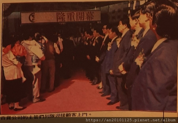 民國76年11月11日太平洋SOGO百貨公司開幕 主管們一字排開.迎接客戶上門 一個台北嶄新東區商圈 在這種濃濃日式迎客禮儀中.揭開新的一頁 到現在SOGO百貨.還是遠東集團的金雞母 可是提供經營技術...