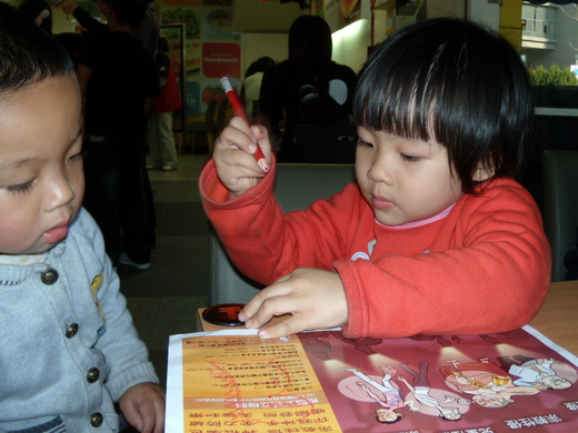 兩個孩子開始雞同鴨講,再加上兩個媽媽雞婆的不停幫腔,一下子出主意要孩子自我介紹(就是我們過年前練的),一下子又要他們一直打招呼,努力的想要展現出媽媽訓練的成果,可惜兩個小寶貝不太買帳,繼續雞同鴨講。不過說也奇怪,兩人依然能繼續溝通。