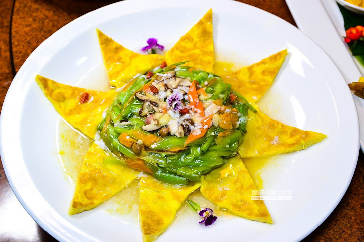 美人心就是金針花的嫩莖,這可是日月潭頭社村種植的金針花註冊的名字,吃起來清脆甘甜又鮮嫩,搭配上芡汁、鮮香菇、破布子和用煎蛋花樣的擺盤,不論是視覺上味覺上都很雅緻
