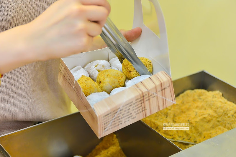 DIY麻糬就是白麻糬和沾粉分開,有12、18、22片三種大小,包餡麻糬則是有可愛的小姊姊現場手工製作