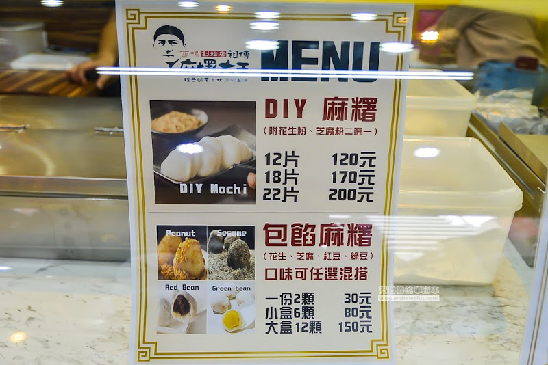 櫃檯上方也有簡單明瞭的菜單燈箱,麻糬分成包餡麻糬,有花生、芝麻、紅豆、綠豆四種口味,DIY麻糬則有花生和芝麻兩種味道,使用台灣嚴選上等花生、芝麻、不添加防腐劑,現場還有可愛的小姊姊和小鮮肉服務!