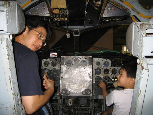 四十歲的爸比和五歲的兒子在中正航空科學博物館,爬進爛爛的飛機模型裡,假裝開飛機,口中還做出飛機起飛的聲音。