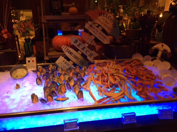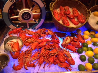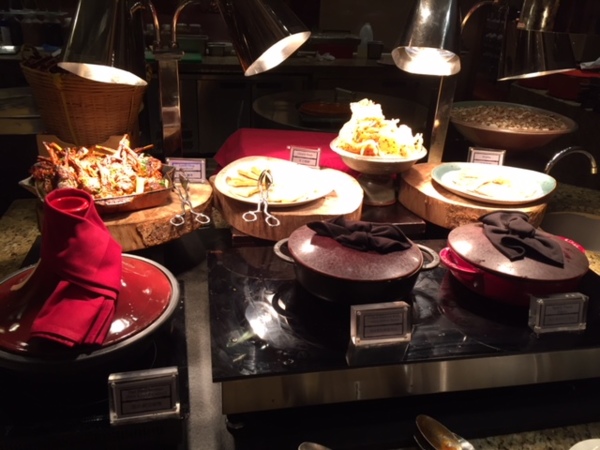 鳴詩餐廳相當寬闊,分成好幾個區域,包括生菜沙拉、前菜、海鮮、日本料理、印度料理、麵點和甜點,還有一大區主菜和熱菜、熱湯,種類繁多。最壯觀是海鮮區,生蠔、龍蝦、帝王蟹腳都請自取,隨時補上鮮貨。
