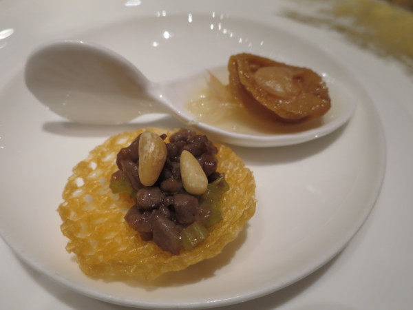 首先是迎賓的前菜;今天是小鮑魚,以及松子牛肉。牛肉炒得鮮嫩,配合松子味道很搭,豐富了口感,也帶入一些甜味。家人都不吃牛肉,結果我一人吃了四份松子牛肉。