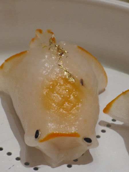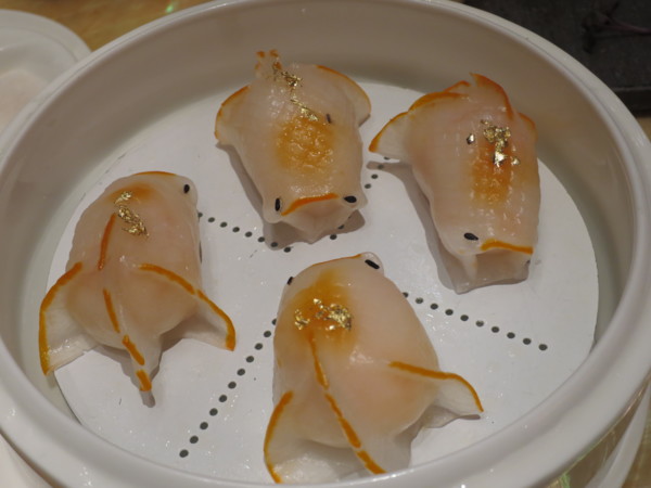 大菜上完,點心是今天重頭戲!「藍天使鮮蝦金魚餃」是最教人驚豔的點心,每一只蝦餃都捏得像是一尾小金魚,討喜可愛。柔軟有韌性的皮裡包著飽滿的蝦仁饀料,口味平衡,吃來相當札實。