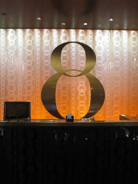 首先來到門口,服務人員禮貌的核對預訂和領位。剛好拍到服務員不在的櫃檯。就是一個氣派的「8」。走進大門,暗黑的走廊令人不得不注意腳下;這才發現地上是投影,引導消費者前進。