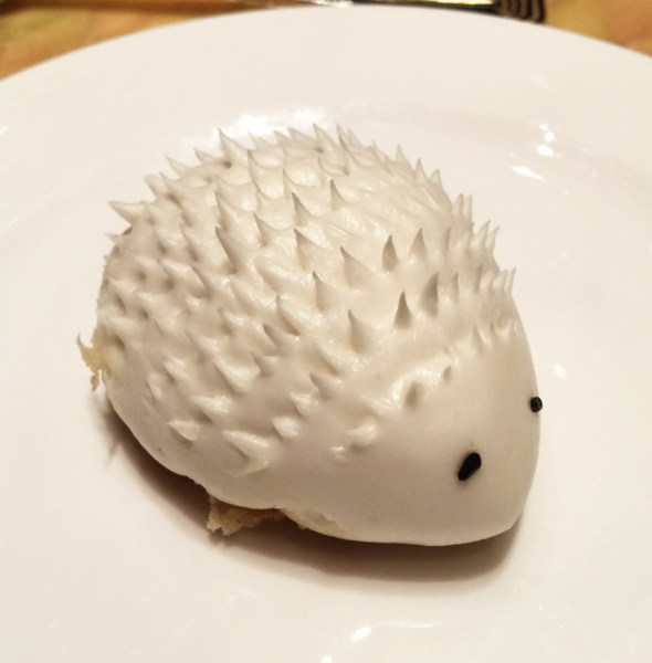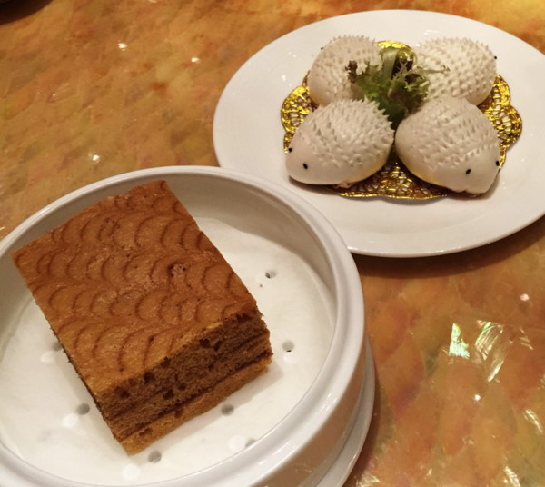 最後又點了馬拉棗茸糕,以及脆香叉燒包。馬拉棗茸糕基本是馬拉糕,用上棗泥做夾層饀料,一上桌就可以聞到棗香。脆香叉燒包又一次出現可愛風,活像個小刺蝟的叉燒包先蒸再煎,皮白底黃,兩種不同口感。看著叉燒包的「刺」,成排整齊;小芝蔴的黑眼格外逗趣,師傅的用心令人咬不下去。難怪來注茶的服務生會笑說,很多客人都捨不得吃。