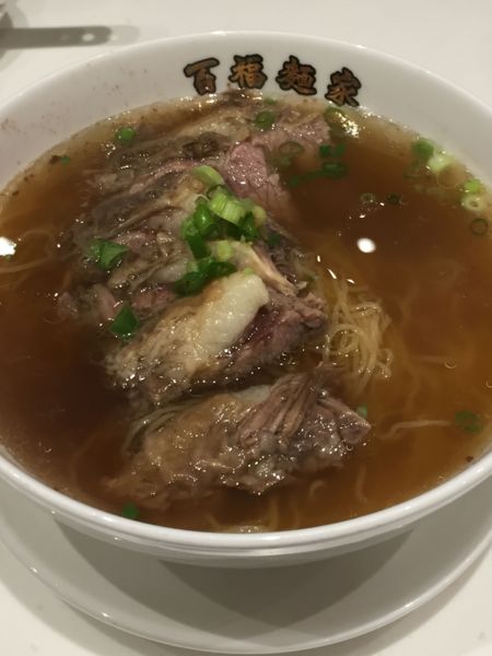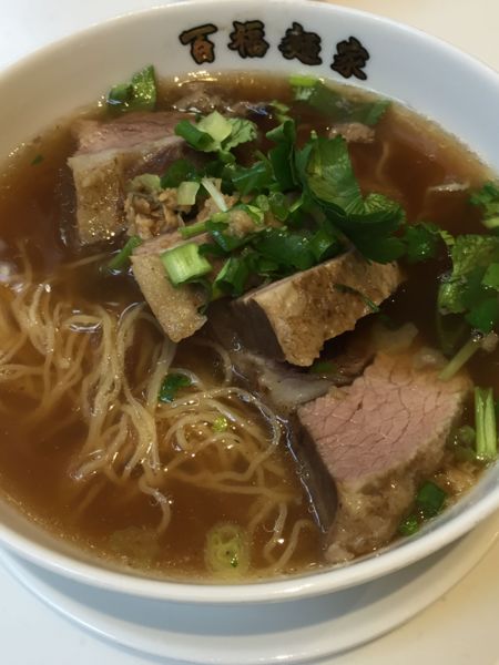 這裡主打牛肉麵,除了潮式牛肉麵,牛腩麵、牛雜麵大約有六種。其中最頂級是「百福甘香崩沙腩麵」,兩次點都沒吃到,因為賣完了。也是來了百福,看了菜牌再回去查,才知道港澳人實在太精吃了,牛腩還分成崩腩、坑腩和爽腩。崩腩是牛胸膈膜肉,數量很少。坑腩就是牛肋肉,肥瘦均勻。