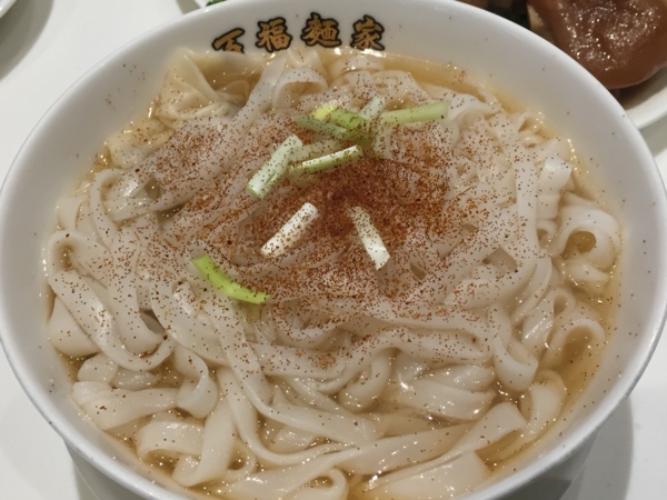 百福的牛肉整條入湯和大骨熬滷,上麵再切塊,所以肉的外觀厚實而且整齊漂亮,看起來覺得牛肉分量格外多。湯比較清淡,當然潮式牛肉麵不會出現豆瓣醬。