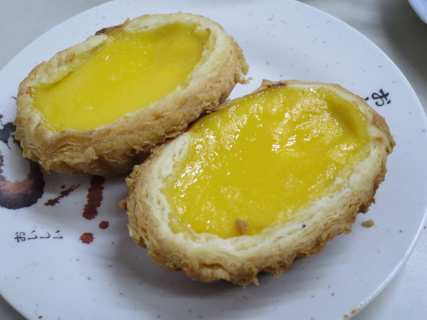 過了一會兒,老闆親自送來盤子,上面是兩個蛋撻;老闆像是講秘密一樣的低嗓門說:「椰撻沒了,多個蛋撻,這個好!」終於,就是這照片裡兩個,跑第四次才嘗到的楕圓形蛋撻!