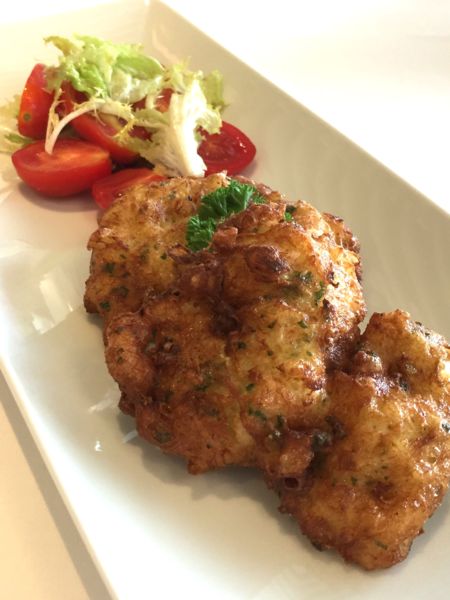 午餐選擇不算多,但看菜名,已經令人心動。今天和朋友選的頭盤是「葡式馬介休薄餅配鮮茄沙律」,以及「蘑菇菜心脆批」。馬介休薄餅和想像不同,其實更像日本料理可樂餅,鮮甜的馬鈴薯和著馬介休炸成厚塊。「脆批」就是脆皮的鹹派。
