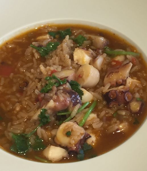 主餐之一是八爪魚飯;八爪魚是葡式料理常見主角,曾在另一家餐廳吃過八爪魚主菜,圓圓壯壯幾隻爪腳,口感卻很脆嫩。今天的八爪魚飯比較像海鮮粥。另一道是烤豬頸肉配馬鈴薯,第一遇到這種整塊的豬頸肉,肉質非常結實──如果習慣軟嫩口感肉質,一定不會喜歡要很用力切的烤豬頸,但這道菜口味還是不錯,經過醃製而入味。