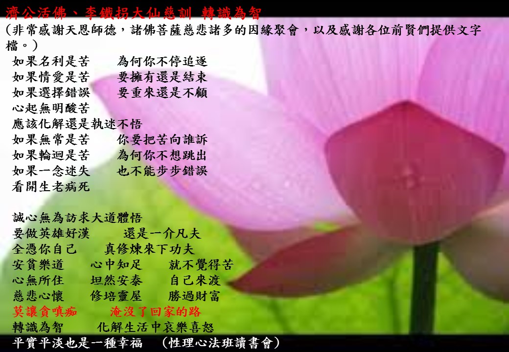 非常感謝天恩師德,活佛恩師慈悲開設性理心法班,諸佛菩薩慈悲諸多的因緣聚會,劉講師慈悲傳達解說最上乘佛法殊勝,以及感恩各位前賢無私慈悲布施,感恩十方諸佛供養。