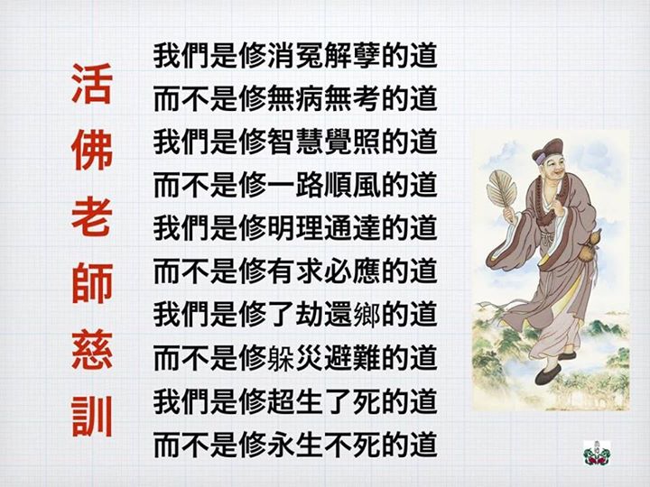 我們為什麼在午未交替的時候,上天大開普渡,就是要我們趕快能夠修脫離這個災難,災難一波接一波一直來,我們逃不了都會接受這個災難,可是只要我們能夠進入涅槃寂樂,就是到達不生不滅我們佛性本體,這一些都無關緊要,我們都不會害怕,為什麼?因為我們已經回歸如如不動的本體。